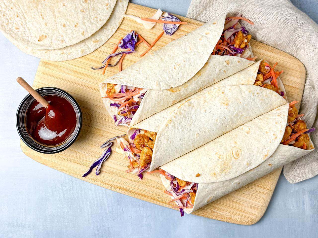 - Verwarm de wraps kort. Verdeel de BBQ-kip over de wraps en schep de koolsla erop. Rol de wraps op en serveer direct.