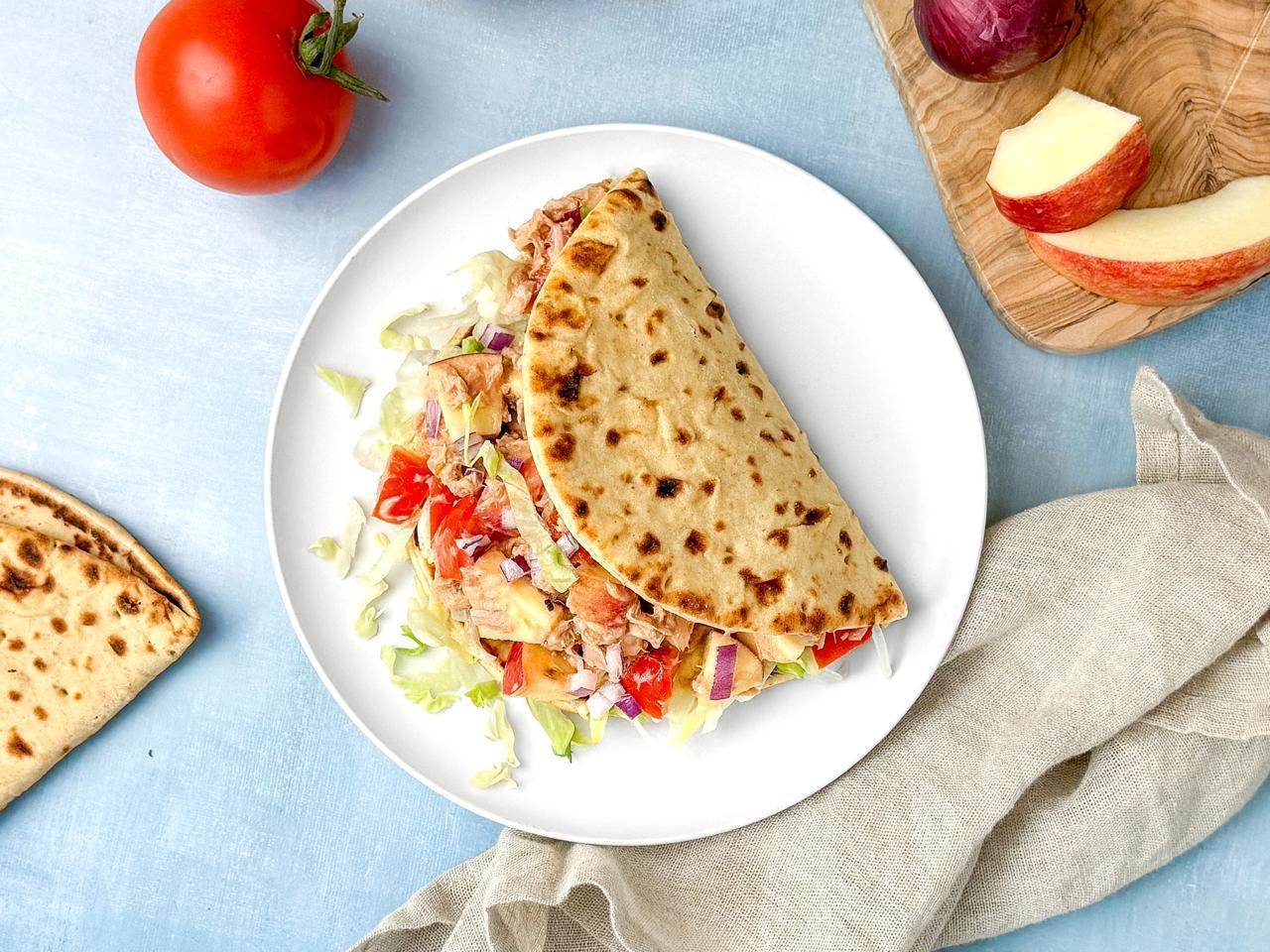 - Verwarm de flatbread volgens de verpakking in een droge pan of oven. Beleg met sla en verdeel de tonijnsalade erover.