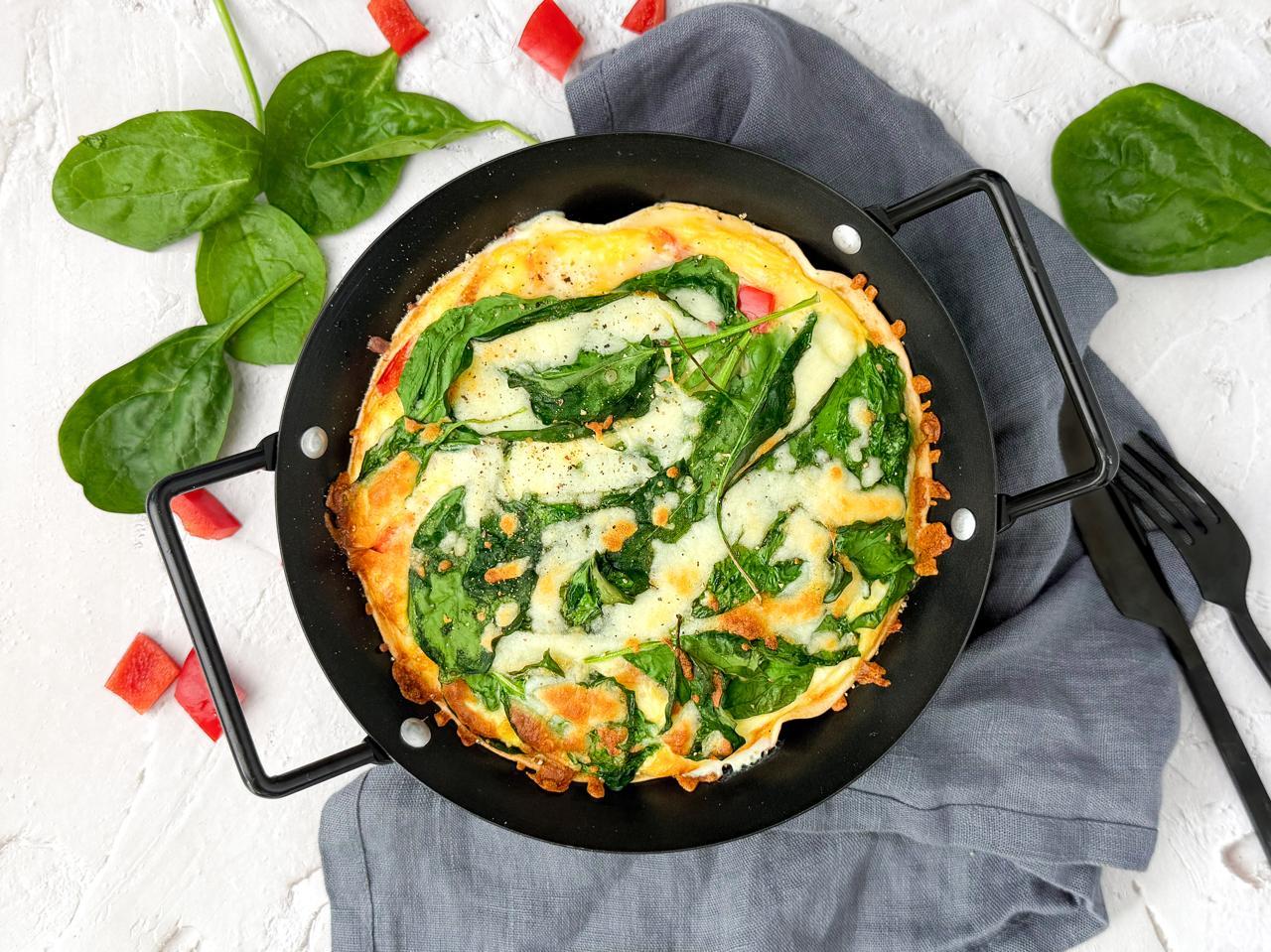 - Verdeel paprika en spinazie over het eimengsel. Bestrooi met mozzarella. Bak 15–20 min tot het ei gestold en licht goudbruin is.