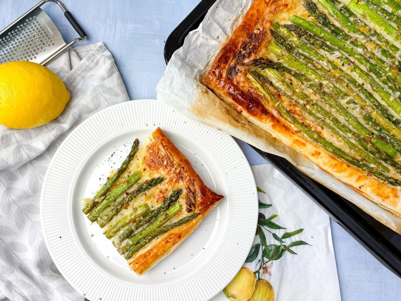 - Snijd de harde uiteinden van de asperges, besprenkel met olijfolie en breng op smaak met zout en peper. Verdeel over de taart en rasp er wat citroenschil over. Strooi de rest van de kaas erover.