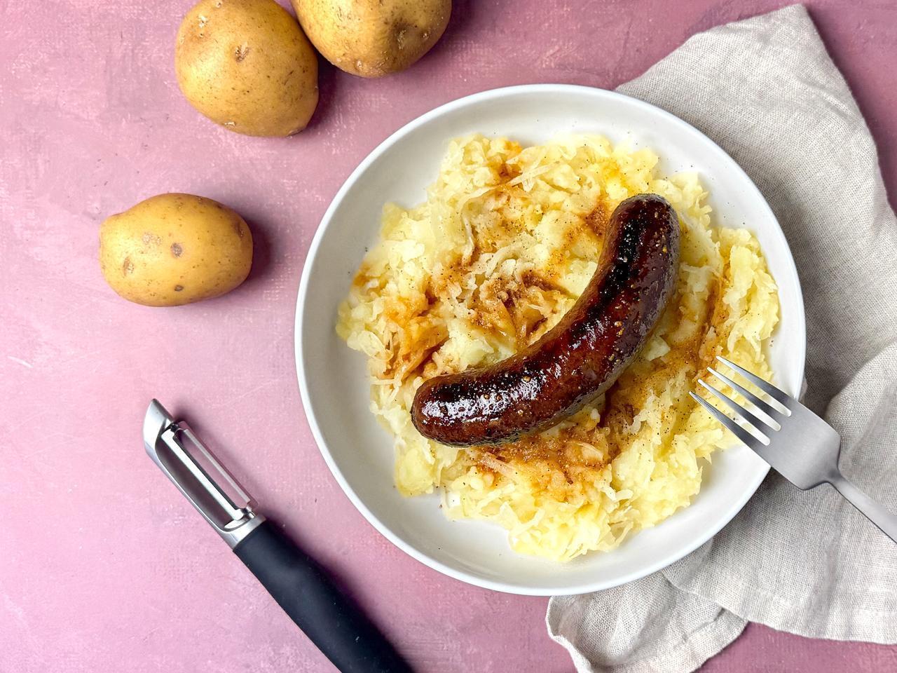 - Giet de zuurkool en aardappelen af. Stamp de aardappelen fijn en voeg beetje bij beetje de zuurkool toe met een scheut melk. Breng op smaak met peper en zout en serveer met de worst en jus.